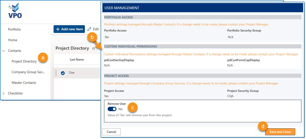 e. All of the user's permissions to VPO will be removed within a few minutes. They will be automatically removed from Project Directories and in Master Contacts, they will be moved to the Inactive Contacts view (selectable from the Views dropdown).